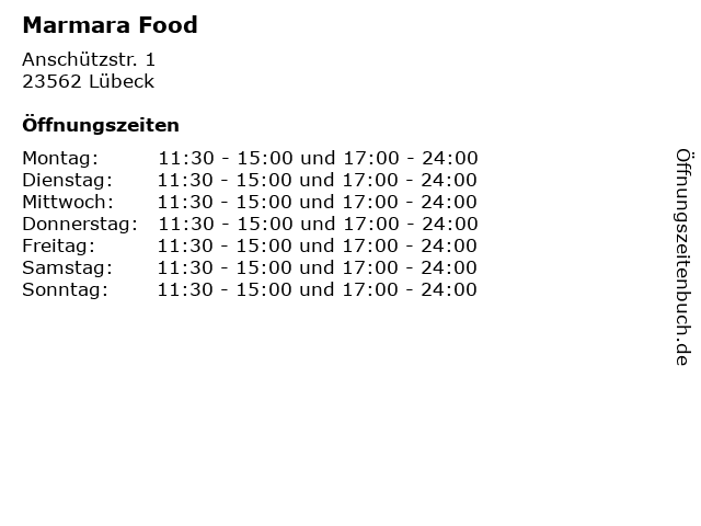 | Öffnungszeiten Marmara Food in Lübeck anzeigen | |