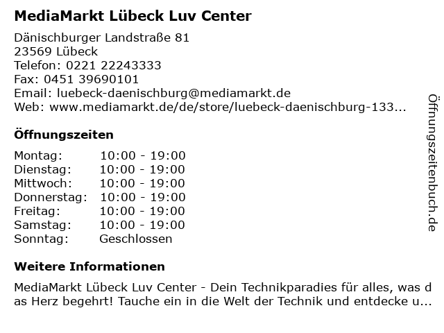 | Öffnungszeiten MediaMarkt Lübeck Luv Center in Lübeck anzeigen | |