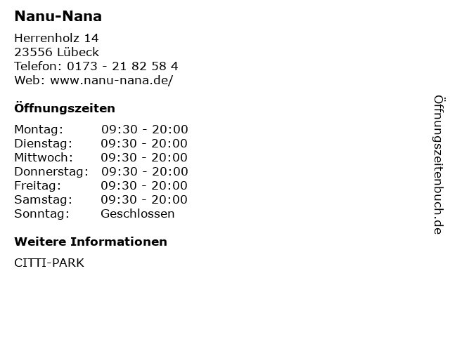 | Öffnungszeiten Nanu-Nana in Lübeck anzeigen | |