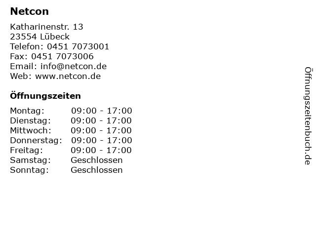 | Öffnungszeiten Netcon in Lübeck anzeigen | |