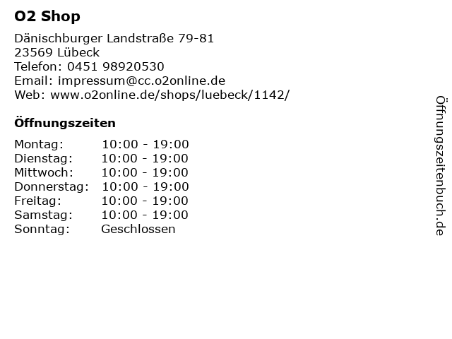 | Öffnungszeiten O2 Shop in Lübeck anzeigen | |