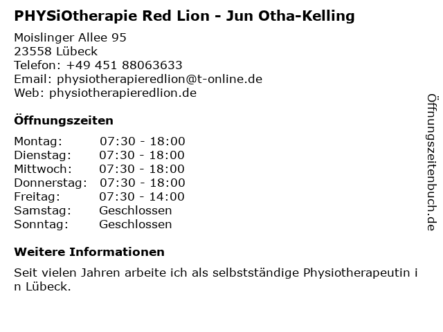 Branchen & Suchbegriffe zu PHYSiOtherapie Red Lion - Jun Otha-Kelling:fango, hypnose, jun, kelling, krankengymnastik, lion, manuelle therapie, massagen, otha, physiotherapie, red |