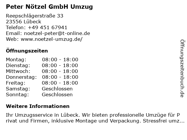 | Öffnungszeiten Peter Nötzel GmbH Umzug in Lübeck anzeigen | |
