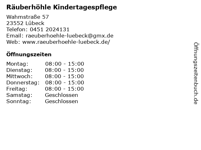 | Öffnungszeiten Räuberhöhle Kindertagespflege in Lübeck anzeigen | |