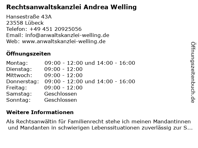 3 Rechtsanwaltskanzlei Muhlack - Celik - Kietzmann (Entfernung: 1,14 km) An der Untertrave 81-83, 23552 Lübeck 5 Rechtsanwaltskanzlei Becker+Henke Partnerschaft - Bürozeiten (Entfernung: 1,88 km) Kanalstraße 80, 23552 Lübeck 6 |