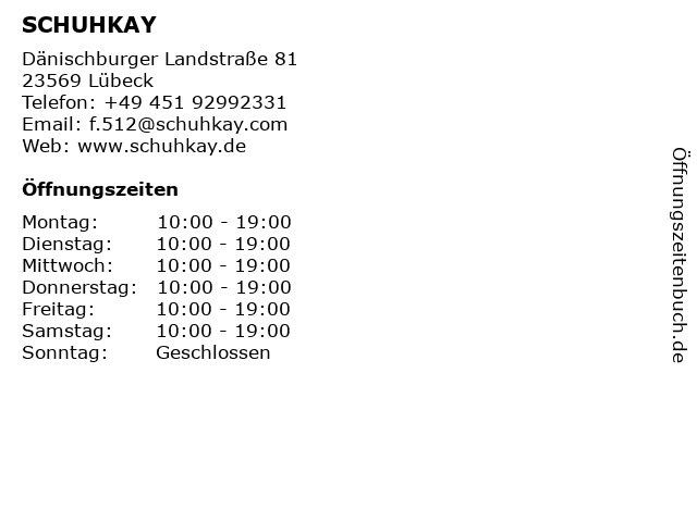 | Öffnungszeiten SCHUHKAY in Lübeck anzeigen | |