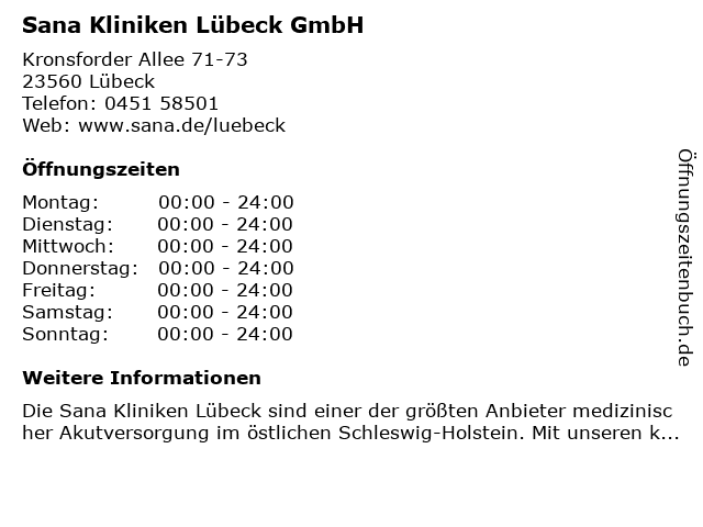 | Öffnungszeiten Sana Kliniken Lübeck GmbH in Lübeck anzeigen | |