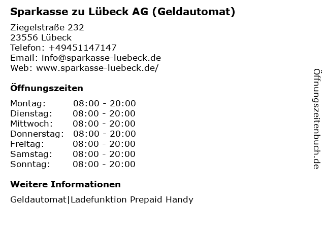 Sparkasse zu Lübeck AG (Geldautomat) in Lübeck: Telefonnummer, Öffnungszeiten und Adresse
