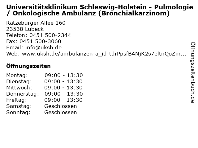 Branchen & Suchbegriffe zu Universitätsklinikum Schleswig-Holstein - Pulmologie / Onkologische Ambulanz (Bronchialkarzinom):ambulanz, arzt, behandlung, bronchialkarzinom, heilung, holstein, krankheit, medikament, medizin, onkologische, pulmologie, universitätsklinikum |
