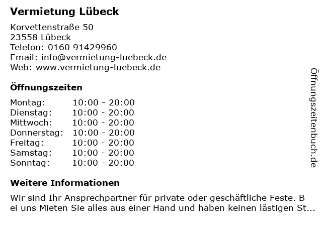 | Öffnungszeiten Vermietung Lübeck in Lübeck anzeigen | |