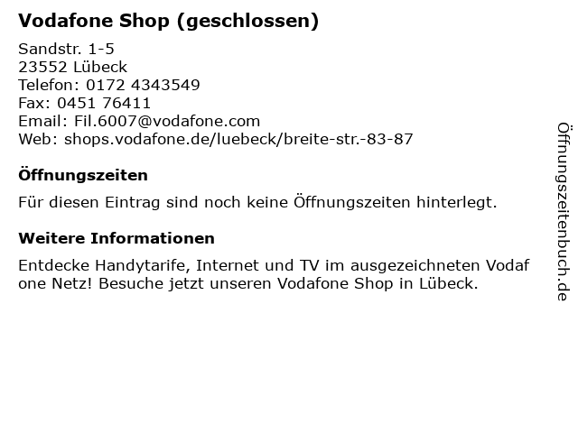 | Öffnungszeiten Vodafone Shop (geschlossen) in Lübeck anzeigen | |