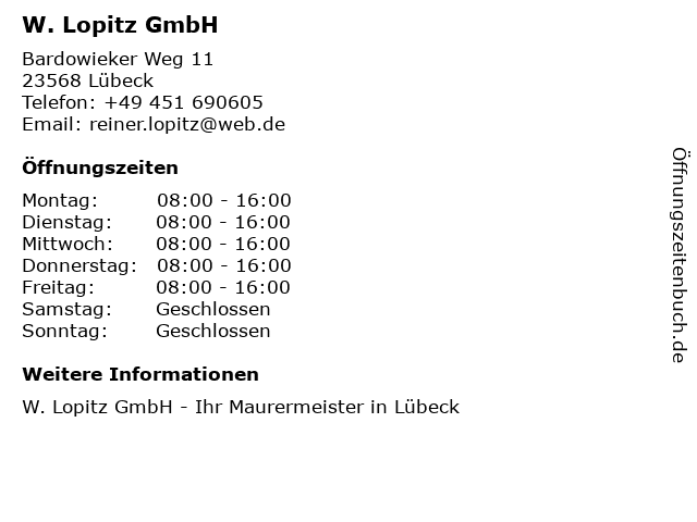 | Öffnungszeiten W. Lopitz GmbH in Lübeck anzeigen | |