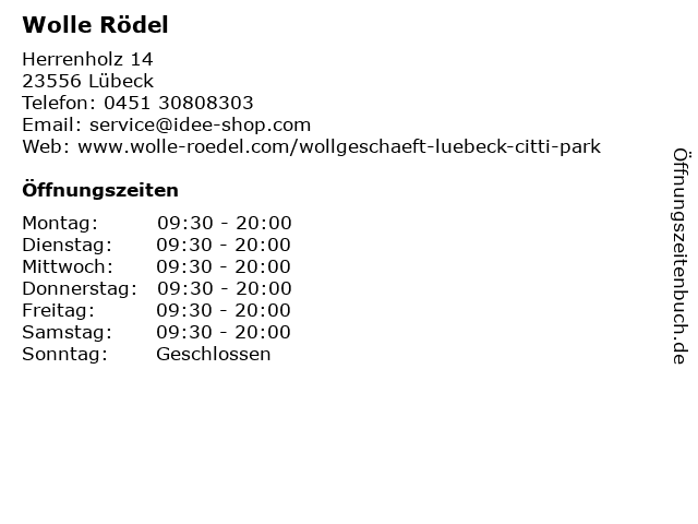 | Öffnungszeiten Wolle Rödel in Lübeck anzeigen | |