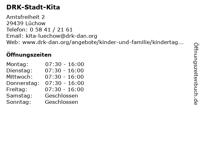 | Öffnungszeiten DRK-Stadt-Kita in Lüchow anzeigen | |