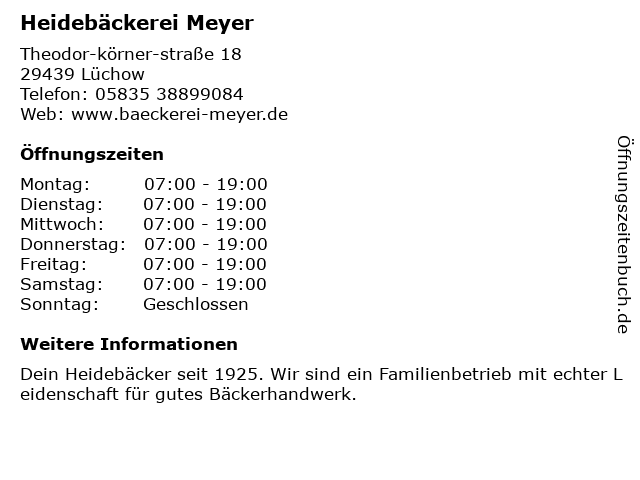 | Öffnungszeiten Heidebäckerei Meyer in Lüchow anzeigen | |