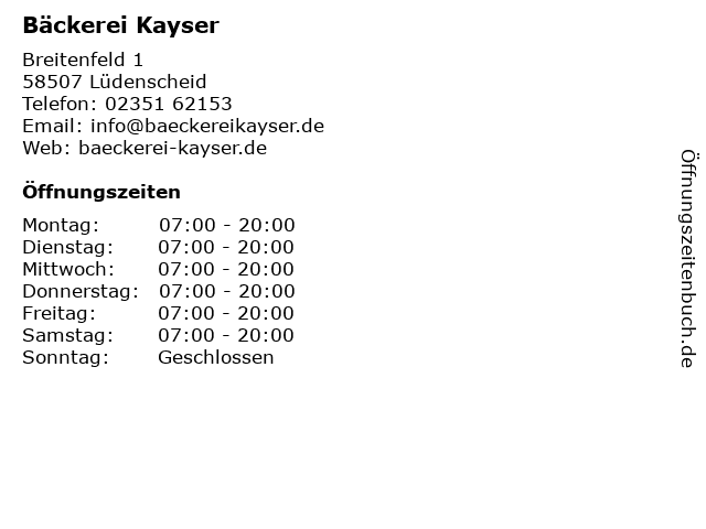 | Öffnungszeiten Bäckerei Kayser in Lüdenscheid anzeigen | |