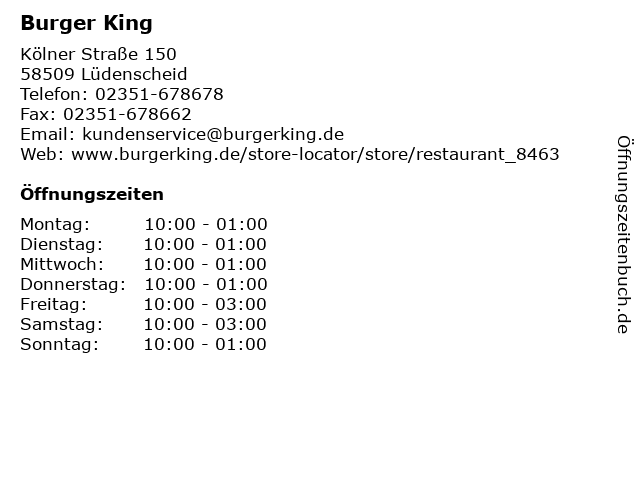 | Öffnungszeiten Burger King in Lüdenscheid anzeigen | |