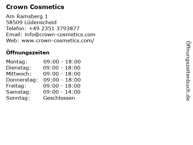 | Öffnungszeiten Crown Cosmetics in Lüdenscheid anzeigen | |