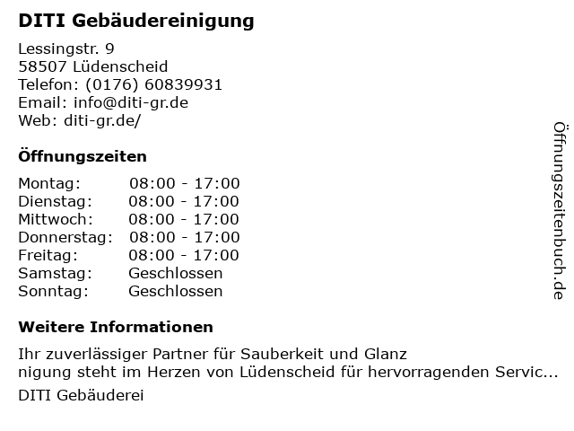 | Öffnungszeiten DITI Gebäudereinigung in Lüdenscheid anzeigen | |
