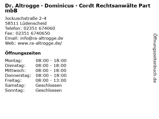 Branchen & Suchbegriffe zu Dr. Altrogge ∙ Dominicus ∙ Cordt Rechtsanwälte PartmbB:altrogge, cordt, dominicus, dr., partmbb, rechtsanwälte, ∙ |