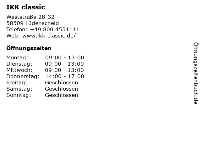 | Öffnungszeiten IKK classic in Lüdenscheid anzeigen | |