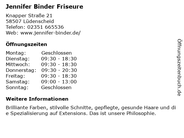 | Öffnungszeiten Jennifer Binder Friseure in Lüdenscheid anzeigen | |