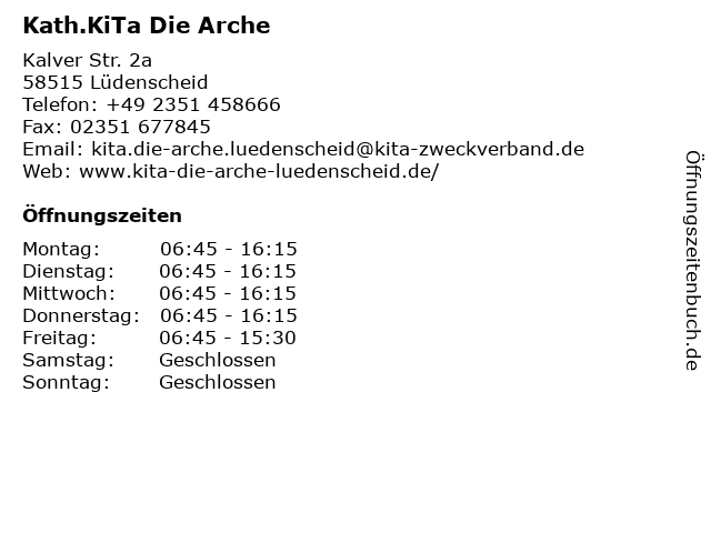 | Öffnungszeiten Kath.KiTa Die Arche in Lüdenscheid anzeigen | |