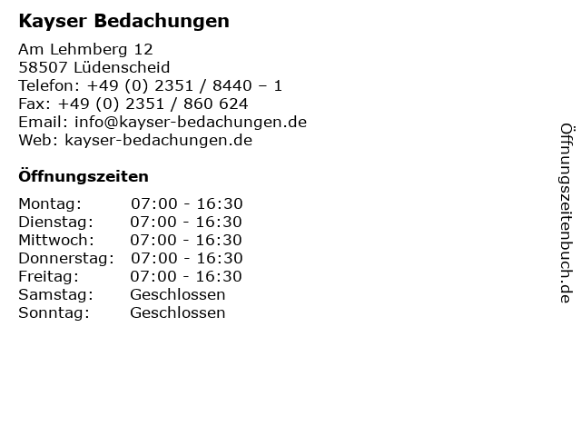 | Öffnungszeiten Kayser Bedachungen in Lüdenscheid anzeigen | |