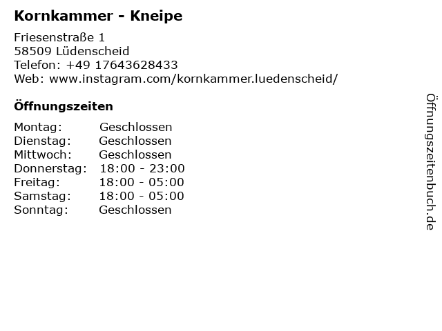 | Öffnungszeiten Kornkammer - Kneipe in Lüdenscheid anzeigen | |