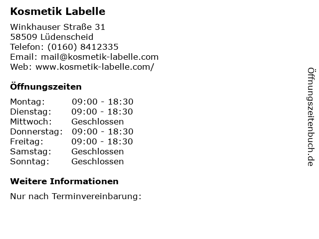 | Öffnungszeiten Kosmetik Labelle in Lüdenscheid anzeigen | |