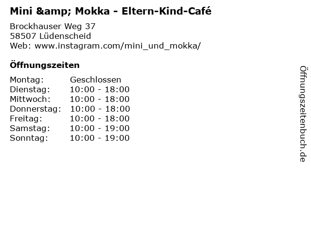 | Öffnungszeiten Mini & Mokka - Eltern-Kind-Café in Lüdenscheid anzeigen | |