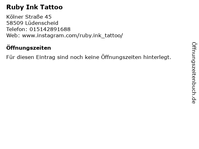 | Öffnungszeiten Ruby Ink Tattoo in Lüdenscheid anzeigen | |