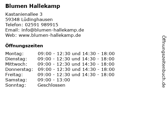 | Öffnungszeiten Blumen Hallekamp in Lüdinghausen anzeigen | |