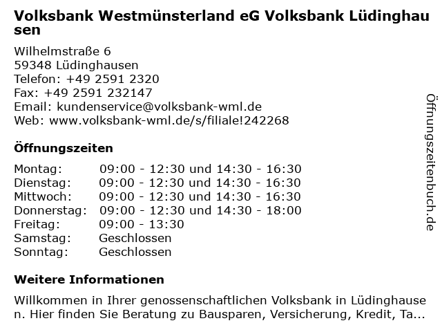2 Sparkasse Westmünsterland (Geldautomat) (Entfernung: 0,35 km) Geschwister-Scholl-Straße 28, 59348 Lüdinghausen 3 Sparkasse Westmünsterland (Filiale) (Entfernung: 0,35 km) Geschwister-Scholl-Straße 28, 59348 Lüdinghausen 4 Sparkasse Westmünsterland (Private Banking) (Entfernung: 0,48 km) Graf-Wedel-Straße 1, 59348 Lüdinghausen 6 VR-Bank Westmünsterland eG (Geldautomat) (Entfernung: 11,55 km) Lüdinghauser Straße 197, 48249 Dülmen |