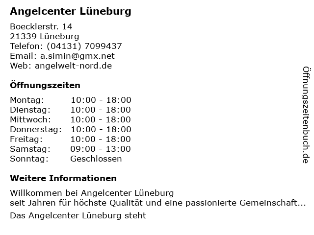 | Öffnungszeiten Angelcenter Lüneburg in Lüneburg anzeigen | |