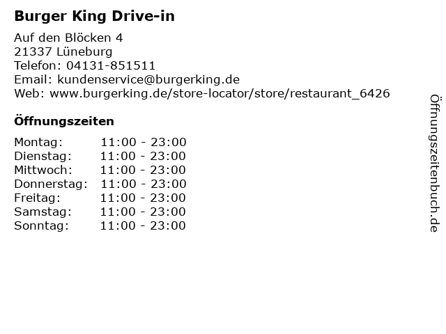 | Öffnungszeiten Burger King Drive-in in Lüneburg anzeigen | |