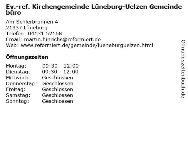 Branchen & Suchbegriffe zu Ev.-ref. Kirchengemeinde Lüneburg-Uelzen Gemeindebüro:ev., evangelisch, evangelische, gemeindebüro, hinrichs, kirche, kirchengemeinde, pastor, pfarrämter, ref., reformierte, uelzen |
