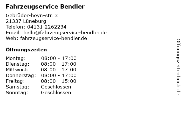| Öffnungszeiten Fahrzeugservice Bendler in Lüneburg anzeigen | |