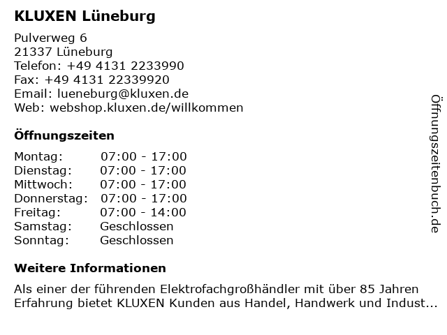 | Öffnungszeiten KLUXEN Lüneburg in Lüneburg anzeigen | |