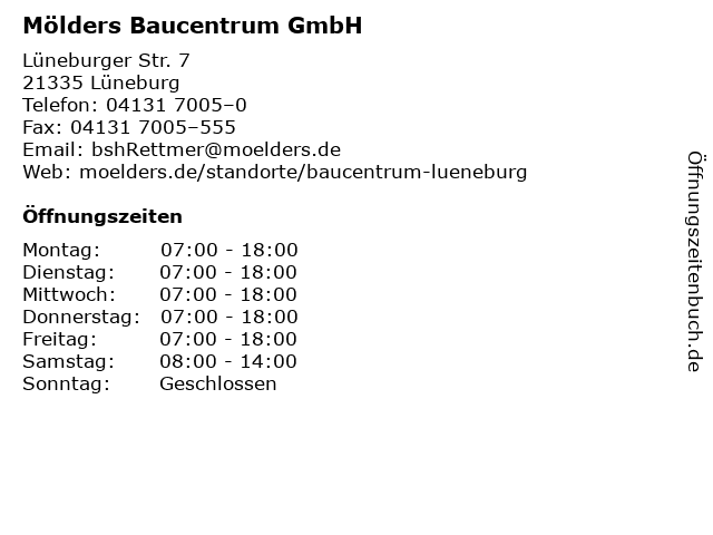 | Öffnungszeiten Mölders Baucentrum GmbH in Lüneburg anzeigen | |
