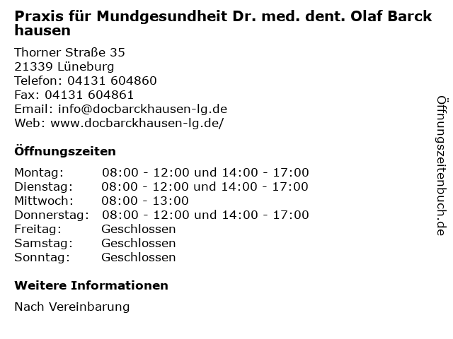 Branchen & Suchbegriffe zu Praxis für Mundgesundheit Dr. med. dent. Olaf Barckhausen:barckhausen, dent., dr., facharzt, med., mundgesundheit, olaf, praxis, spezialist, sprechzeiten, zahnarzt, zahnarztpraxis, zahnheilkunde, zahnmedizin |