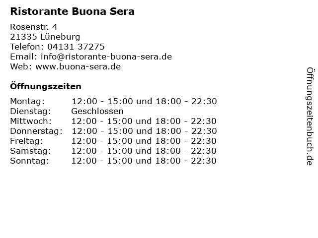 | Öffnungszeiten Ristorante Buona Sera in Lüneburg anzeigen | |