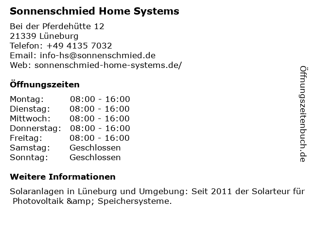 | Öffnungszeiten Sonnenschmied Home Systems in Lüneburg anzeigen | |