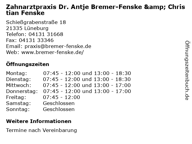 | 2 Blumengalerie zeitgemäße Floristik Antje Cardano (Entfernung: 0,32 km) Altenbrücker Damm 1a, 21337 Lüneburg 3 Zahnarztpraxis Dr. med. dent. Uwe-Karsten Rosenau (Entfernung: 0,37 km) Haagestaße 3d, 21335 Lüneburg 6 |