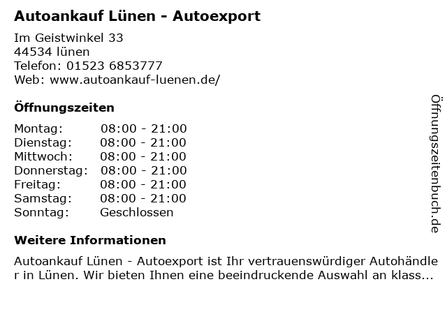 | Öffnungszeiten Autoankauf Lünen - Autoexport in lünen anzeigen | |