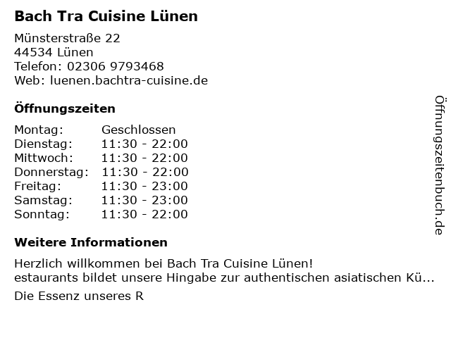 | Öffnungszeiten Bach Tra Cuisine Lünen in Lünen anzeigen | |