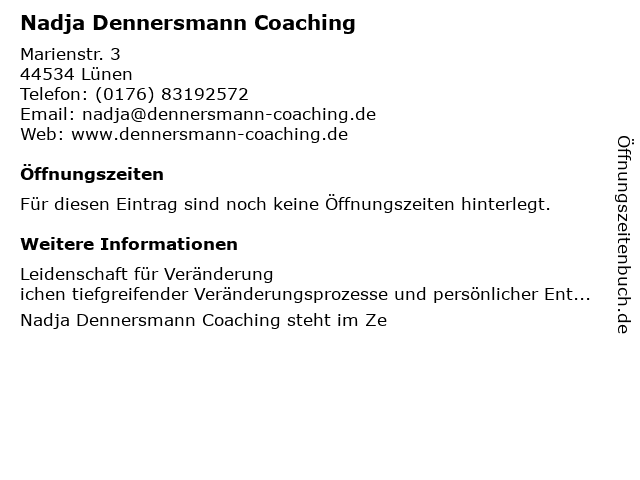 | Öffnungszeiten Nadja Dennersmann Coaching in Lünen anzeigen | |