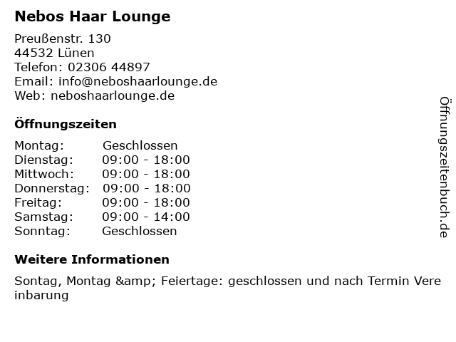 | Öffnungszeiten Nebos Haar Lounge in Lünen anzeigen | |