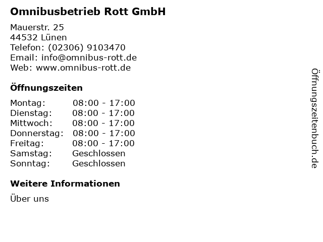 | Öffnungszeiten Omnibusbetrieb Rott GmbH in Lünen anzeigen | |