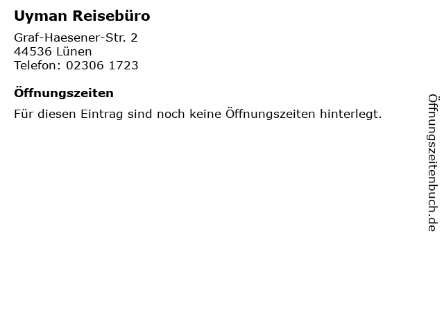 | Öffnungszeiten Uyman Reisebüro in Lünen anzeigen | |